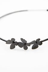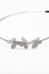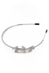 • A headband adorned with sculpted butterflies, creating a refined, whimsical accent on a glitter metal body.
