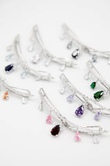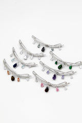 - A light metal body with distinct teardrop-cut crystals. The dangling design offers movement and catches light at every angle for a never-ending sparkle.