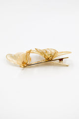 - A large flower duo hair clip that features wispy, delicate, and light petal designs on a gold body. Beautiful craftsmanship is carried through the entire framework.