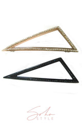 - 80’s inspired oversized triangle barrettes embellished with rhinestones in gold or black on a French barrette clasp.