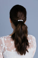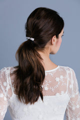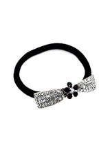 This ponytail holder features a mini crystal flower + crystal-studded piece to sit perfectly on top of the base of your ponytail.