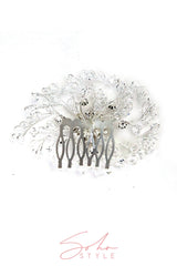 - This small bridal hair comb features small rhinestones and beads embellished to swirl together onto the silver comb.