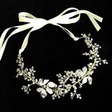 A pearl organza ribbon tie headpiece with delicate baby's breath floral details. This versatile special occasion headwear adds soft romantic details to style into any special occasion hairstyle!