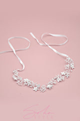 This delicate wedding headband accessory shimmered with soft pearls, crystal embellished leaves, and silver intricate flowers, complementing your veil and enhancing your bridal radiance.
